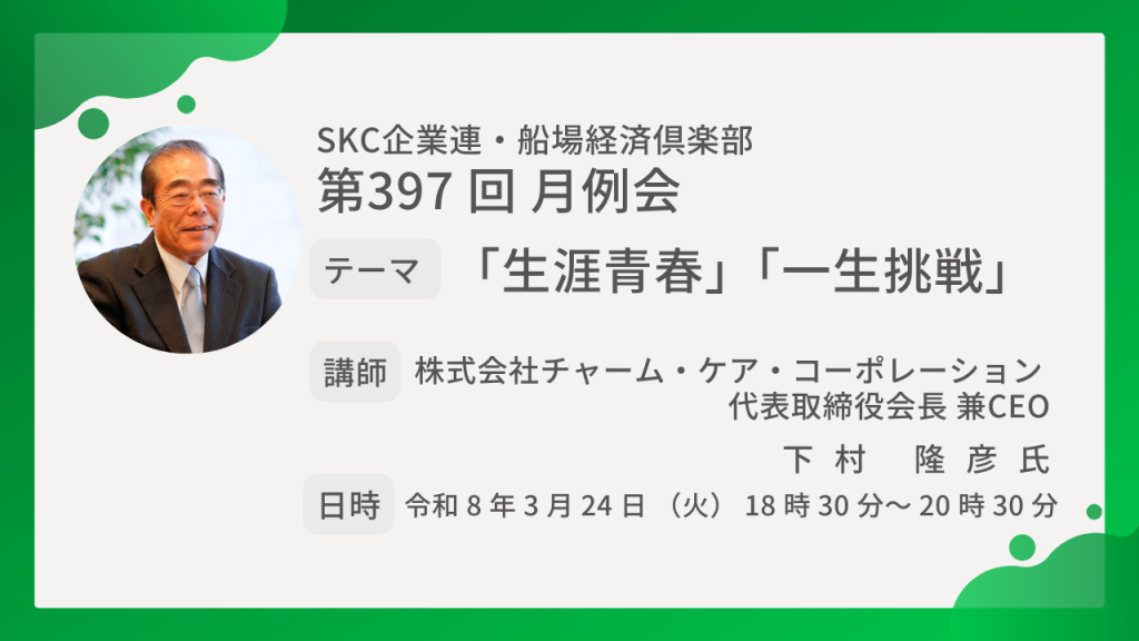 月例会(第397回)のご案内です。   講師   株式会社チャーム・ケア・コーポレーション 代表取締役会長 兼CEO 下村 隆彦 氏 テーマ 「生涯青春」「一生挑戦」   「3人に1人」が65歳以上の時代。 超高齢社会の日本では介護現場の人手不足が深刻化しています。 そんな業界の変革に挑むのが今回の…